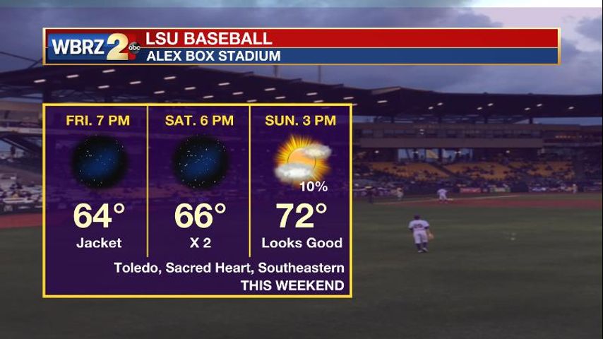 LSU Baseball kicks off another three game weekend against Toledo this evening. Take a jacket to the game, as temperatures will fall out of the low 60s and into the 50s. A similar forecast is expected for game two against Sacred Heart on Saturday evening. Sunday afternoon will bring clouds and possibly some sun with temperatures around 70 degrees for the revenge game against Southeastern.