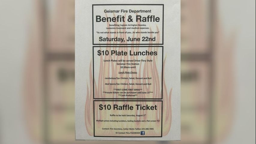 A plate lunch fundraiser and raffle will be held at the Geismar Fire Station on June 22. Starting at 10:30 a.m., jambalaya plates and red bean plates with chicken can be purchased for $10 until they run out of food. Raffle tickets are $10 and the drawing will take place Aug. 3
