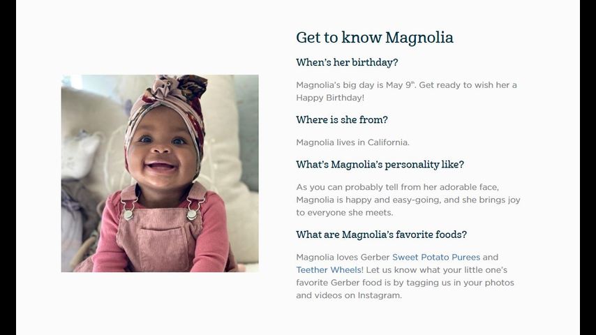 "As the newest Gerber Spokesbaby, Magnolia represents every Gerber baby, and her family’s story serves as a reminder of what unites all parents and drives everyone at Gerber: the promise to do anything for baby," the news release stated.