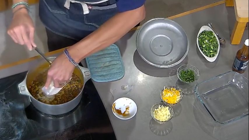 Sprinkle ½ of the cheddar Jack and ½ white cheddar cheese over the casserole.