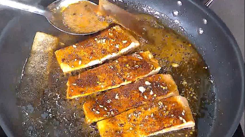 Add garlic to the skillet and cook until fragrant, 1 minute. Add the honey mixture and sliced lemons and cook until sauce is reduced by about 1/3. Baste salmon with the sauce.