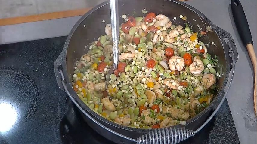 In same skillet over medium-high heat, heat 1 tablespoon oil. Cook onions, peppers, and a pinch of salt, stirring occasionally, onion is softened, about 7 minutes. Add garlic and cook, stirring, until fragrant, about 1 minute more. Add lima beans and 3/4 cup water. Cover and simmer until beans are tender and liquid has evaporated, about 6 minutes. Transfer to bowl with tomato mixture.