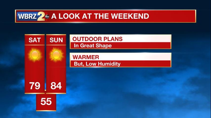 Up Next: Outdoor plans are in great shape this weekend. Whether it be LSU Baseball, or one of many area festivals, the weather will not create any problems for events--just remember sunscreen! Saturday will be sunny with high temperatures in the upper 70s followed by another clear night with low temperatures in the mid 50s. By Sunday, temperature moderation will be underway as mainly clear skies continue. Thanks to low humidity, the warmth should feel comfortable. Afternoon thermometers will continue to climb early next week but lows will remain seasonable and in the low 60s. The next chance of rain is not expected until late next week.