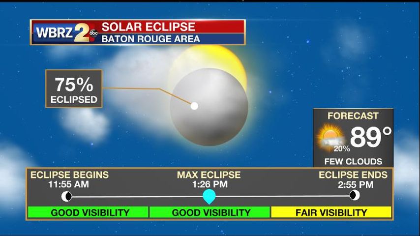 The solar eclipse begins at 11:55am today and lasts until 2:55pm. 75 percent of the sun will be eclipsed in the Baton Rouge area during peak viewing at 1:26pm. If you intend to view the solar eclipse then you will need to make certain that your solar viewing glasses are ISO 1232-2 certified. This certification should be printed somewhere on the inside frames of the glasses and ensures that your eyes will be completely protected while viewing the eclipse. It is not acceptable to view the eclipse wearing multiple pair of sunglasses or with any lenses that do not meet the certification safety standards. Please use common sense during the eclipse and keep your eyes on the road if driving! For more on where and how to view the eclipse, CLICK HERE.