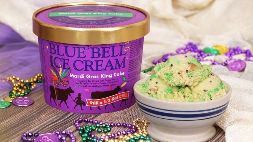Mardi Gras King Cake is made with cinnamon cake flavored ice cream, pastry pieces, a colorful cream cheese swirl, and candy sprinkles. For the first time ever, the holiday-themed ice cream will be available in all areas where Blue Bell products are sold.