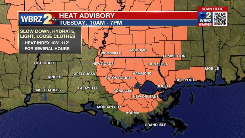 A HEAT ADVISORY will be in effect from 10am 7pm Tuesday across the entire WBRZ Weather Forecast Area, except St. Mary Parish. Heat index values of 108 to 112 degrees are expected increasing the chance of heat illnesses. Drink plenty of fluids, stay in an air-conditioned room, stay out of the sun, and check up on relatives and neighbors. Young children and pets should never be left unattended in vehicles under any circumstances.