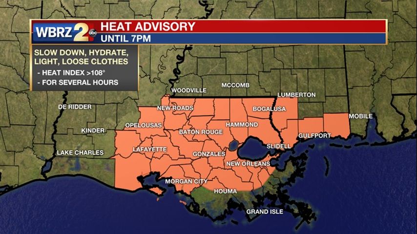 Today and Tonight: Another oppressively hot day ahead to start your workweek. A Heat Advisory is in effect for all southeastern parishes in Louisiana, extending from Lafayette to New Orleans. Temperatures will be warming quickly, breaking into the 80s around 8 AM and 90s around your lunch hours. Highs will top out near 96°, with heat index values hovering between 105° to 108°. Winds will stay light and out of the west through the day and into this evening. Temperatures will be slow to cool, only dropping into the 80s around 8 PM tonight, as overnight lows drop near 76°.