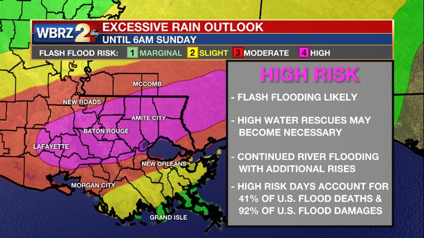 One more round of very heavy rain is expected before the wet, unsettled pattern loosens its grip on the central Gulf Coast. Parts of southeast Louisiana have been placed under rare HIGH RISK for excessive rainfall through Sunday morning.