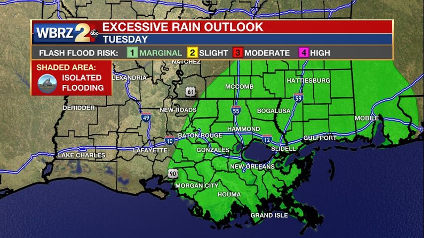 A series of disturbances will roll through the region this week, as a boundary stalls just to our west. This will allow for several rounds of rainfall Tuesday through Thursday, some of which may be heavy at times. 3-6 inches of rain will be likely across metro Baton Rouge with isolated higher amounts possible, especially where any heavier storms set up. This could lead to localized street and flash flooding issues - which is why most of southeast Louisiana is under a 'marginal' threat for excessive rainfall on Tuesday. This will likely be extended into Wednesday as well. Flash Flood watches may be issued by tomorrow.