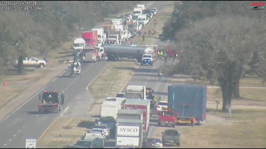 The crash was first reported shortly before 12:30 p.m. Friday on US 190 near LA 415. Traffic cameras showed the jackknifed truck blocking both sides of the highway.