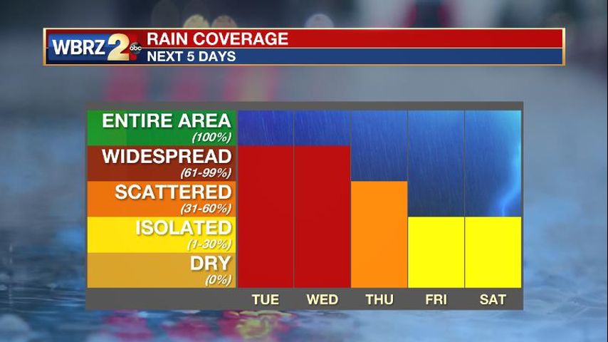 Today and Tonight: On Tuesday, expect partly sunny skies early allowing high temperatures into the mid 80s. Scattered to widespread showers and thunderstorms will develop during the late morning and afternoon hours. About 70 percent of the 13 parish, 3 county area will receive rain today. Any storms will be capable of downpours, gusty wind and frequent lightning. Overnight, activity should subside with low temperatures in the mid 70s.