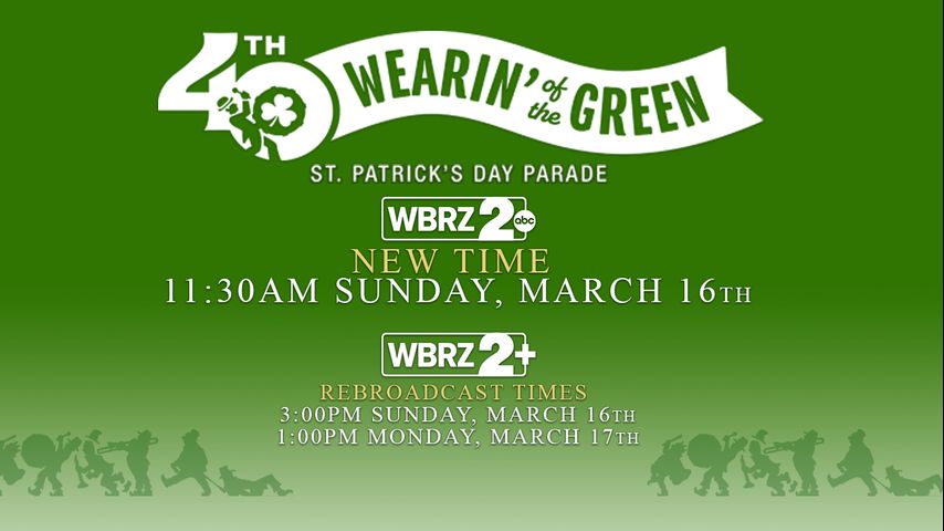 WBRZ's broadcast of the parade will start at 11:30 a.m. on Channel 2, and the parade will be rebroadcast on WBRZ+ at 3 p.m. on Sunday and 1 p.m. on Monday — St. Patrick's Day.