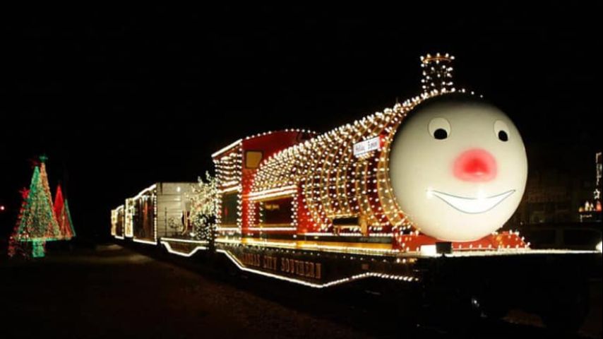 The illuminated engine and railcars are operated by CPKC railways -- one of two several such trains on tour in North America in the runup to Christmas.