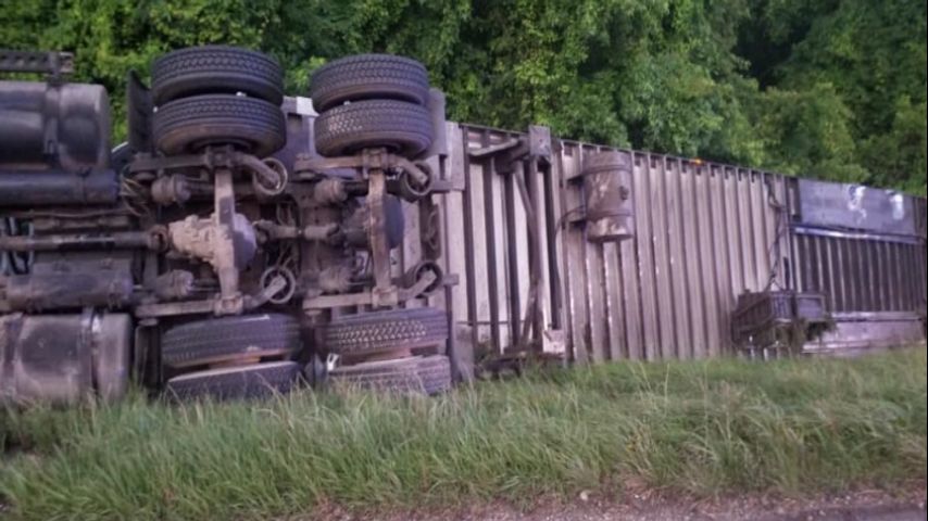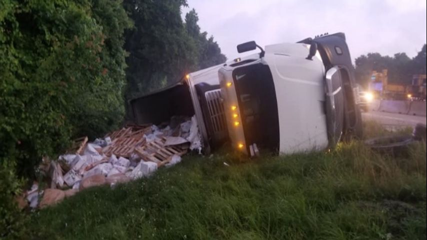 Authorities say the semi truck flipped on I-10 East past Highland Road before 6 a.m. Tuesday. No injuries were reported.