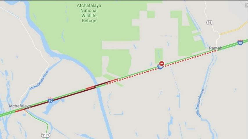 The left lane remains blocked I-10 East at mile marker 126 (Whiskey Bay) due to an accident. Congestion is approaching Henderson. Motorists are advised to use I-49 North to US 190 East as an alternate route.