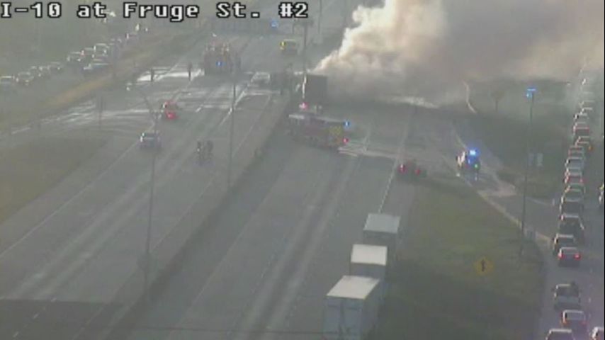 LAKE CHARLES - Two semi-trucks crashed and one is on fire, blocking westbound lanes of I-10 near US-90 in Lake Charles.
