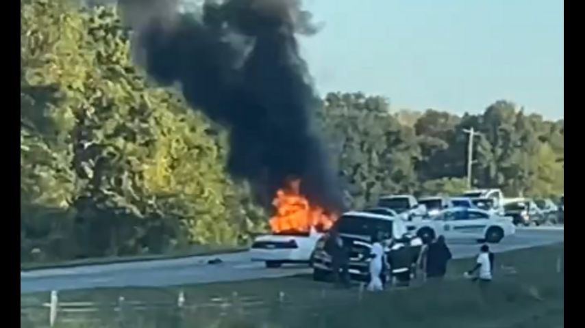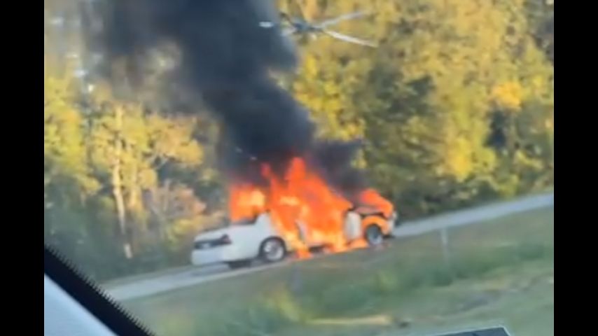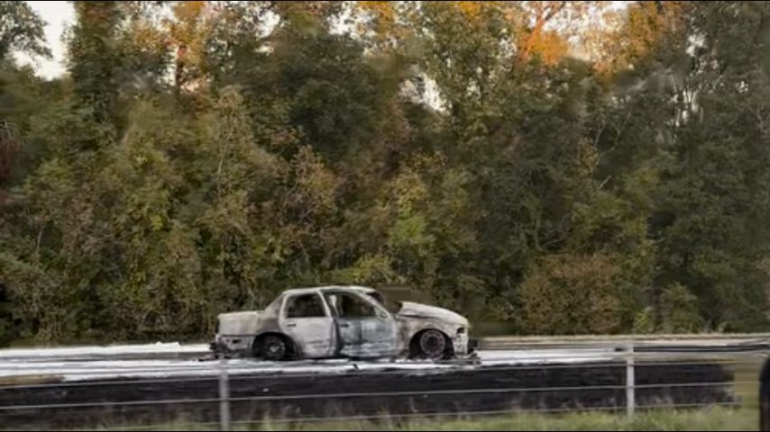 Video shows a car on the road bursting into flames, causing the road to be blocked off as authorities deal with the burning car.