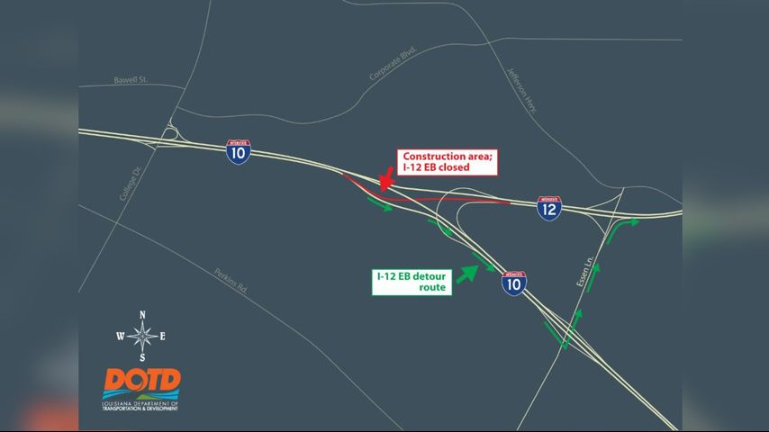 BATON ROUGE - The overnight closures of I-12 East at the I-10/I-12 split in Baton Rouge will extend to Sunday and Monday nights so crews can finish bridge girder work on the College Flyover project, according to the Louisiana Department of Transportation and Development.