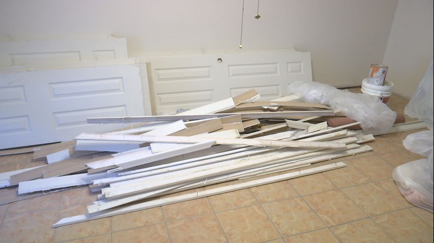 Carter has had to pile up brand new doors and baseboards on her living room floor.