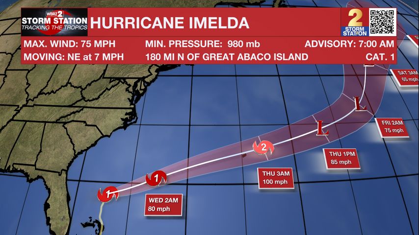 Imelda has strengthened into a hurricane after becoming better organized overnight. Hurricane Hunter aircraft found falling pressure and stronger winds, confirming the storm was gaining intensity. Since then, satellite images have shown continued improvement, and winds are now stronger as a result. Imelda has finally turned away from the U.S. mainland and is beginning to move northeast, with a faster track expected over the next couple of days. Forecast models bring the storm near Bermuda within 36 to 48 hours, though its exact path could shift, especially as it interacts with nearby Hurricane Humberto.