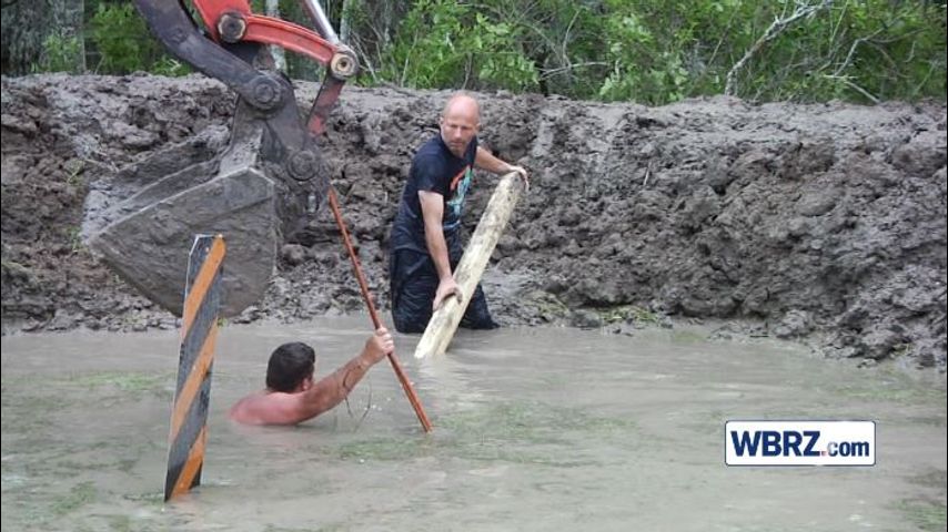 Some local homeowners worked in chest-deep water to help parish workers put a pump in place off Highway 70.