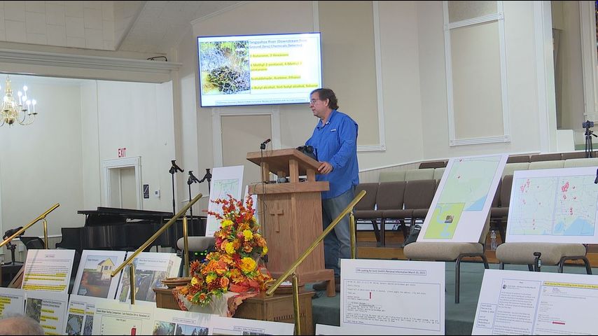 At First Baptist Church in Kentwood, nearly 100 residents gathered Saturday for the third community meeting with independent environmental tester Scott Smith, who shared his latest round of findings. His team collected new samples from the Tangipahoa River in September, samples he says show contamination continues to spread from the Smitty’s Supply site.