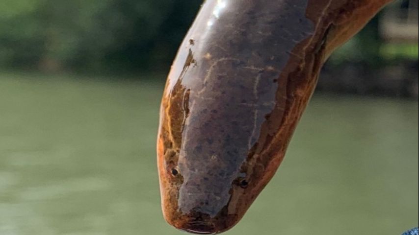 Officials say the eel's diet consists of fish, shrimp, crawfish, frogs, and other aquatic invertebrates.