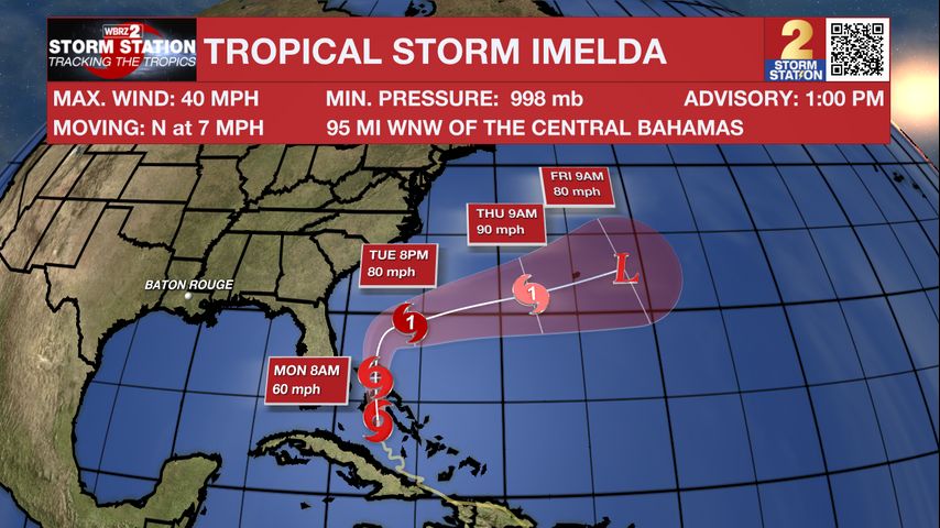 Tropical Depression Nine intensified into Tropical Storm Imelda on Sunday afternoon near the Bahamas. Maximum sustained winds were at 40 mph, and additional strengthening is likely in the coming days. Imelda is forecast to become a hurricane by late Monday or Tuesday.