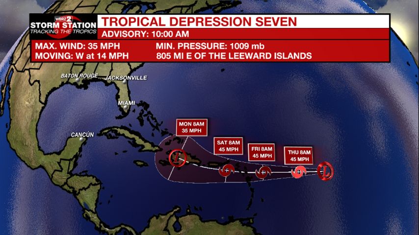 Tropical Depression Seven is now located 805 miles east of the Leeward islands, moving to the west at 14 mph.