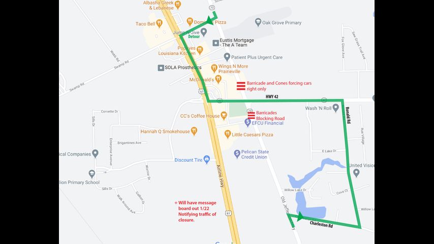 Southbound traffic on LA-73 will be redirected to detour on Ascension Parish Road to Airline Highway. Traffic traveling northbound will be rerouted to Charleston Road and from there, to Ronald Road. On LA-42, the right turn lane from Airline Highway will be closed, then switch traffic over to the right lane later on to patch the straight through lane. A message board will be at the corner of 73 and 42 on Saturday morning to notify drivers of the road closure.