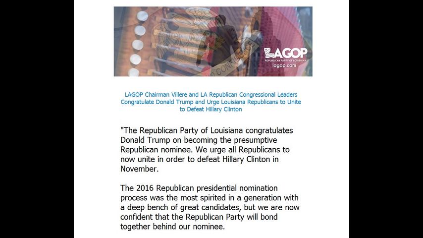"The Republican Party of Louisiana congratulates Donald Trump on becoming the presumptive Republican nominee. We urge all Republicans to now unite in order to defeat Hillary Clinton in November.