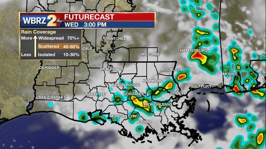 Today and Tonight: Despite mostly cloudy skies, thermometers should still be able to reach 90 degrees by early afternoon. Scattered showers and thunderstorms will then develop, limiting heat for many locations. Of course, any summer storms can produce frequent lightning, downpours and even gusty wind. Measurable rain is expected for 40 percent of the WBRZ Weather forecast area with locations south of I-10 most likely to receive some afternoon precipitation. Overnight will be partly cloudy with lows in the mid 70s.
