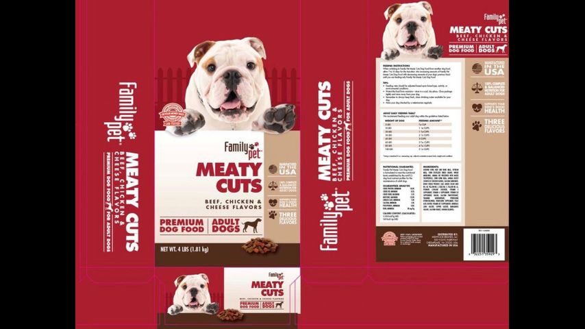 The pet food that tested positive for Aflatoxin is called Family Pet Meaty Cuts Beef Chicken & Cheese Flavors Premium Dog Food. The food is manufactured by Sunshine Mills for Midwood Brands LLC which is sold at Family Dollar stores.