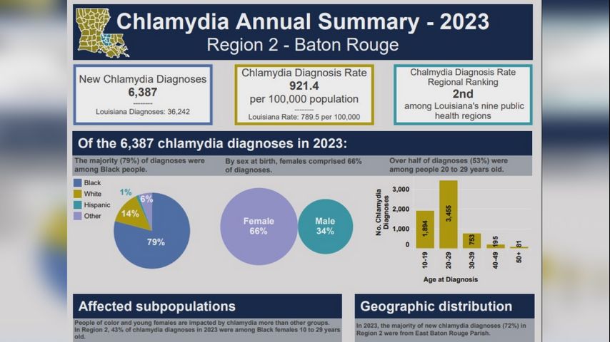 According to 2023 data, Baton Rouge and surrounding parishes saw more than 2,200 new gonorrhea diagnoses in 2023 and over 6,300 for chlamydia.