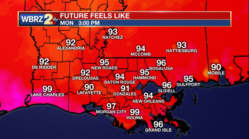Up Next: Dry conditions will hang around for Tuesday too. When we have drier conditions, the air can heat and cool more efficiently. High temperatures will be near 96 and lows will be able to cool to near 71 on Tuesday night. Moisture will then make a slow return. Afternoon showers will be possible starting Wednesday and rain coverage will increase each day approaching the weekend. Temperatures will be a bit cooler in the very low 90s and overnight lows in the mid-70s. Right now the wettest day in the forecast looks to be Saturday. Stay with us as we continue to bring updates on changing weather information!