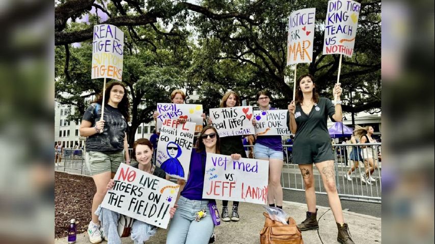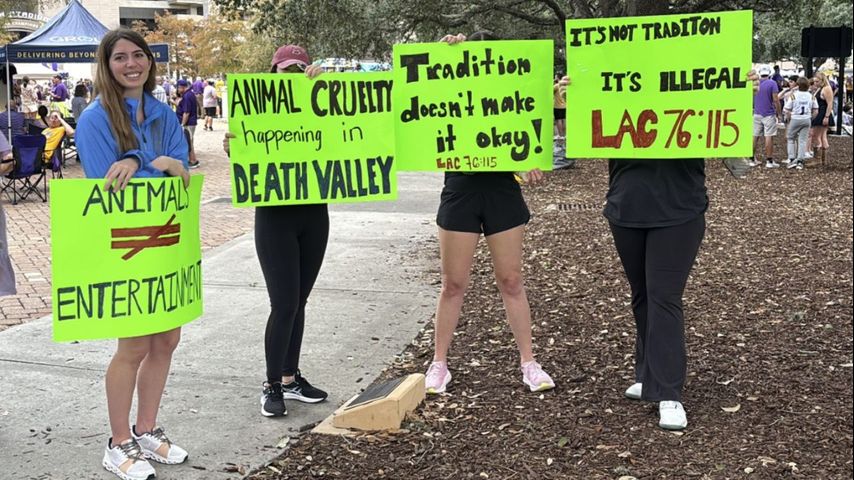 BATON ROUGE - A handful of protesters held up signs outside of Tiger Stadium on Saturday before the LSU and Alabama football game, where a live tiger will be on the sidelines.