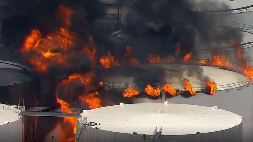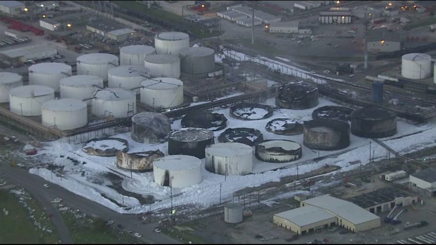 Richardson says crews will continue spraying foam and water on tanks that caught fire to cool them down and prevent the blaze from reigniting. The tanks contained components of gasoline and materials used in nail polish remover, glues and paint thinner.