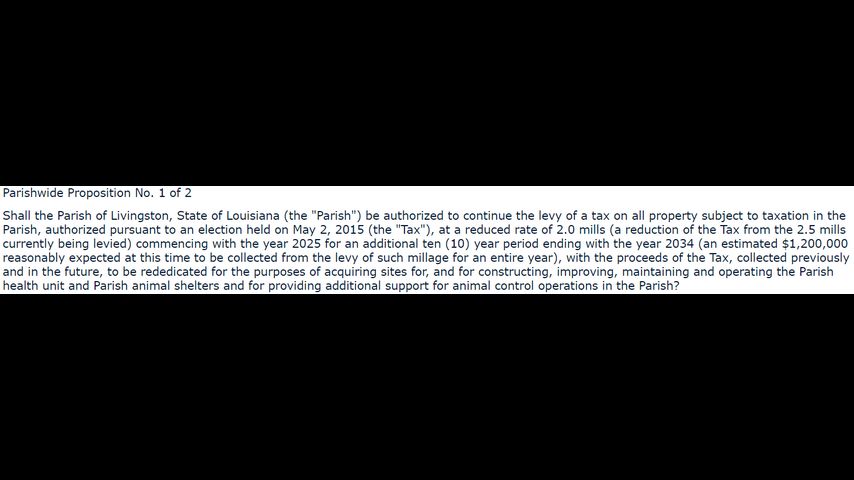 The first proposition renews the tax but lowers the maximum millage rate the council can set to 2. It also gives the parish council the ability to use the funds raised by the taxes to support both the health unit and the animal shelter and animal control programs.