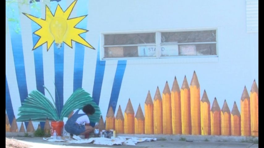 The mural shows several vertical pencils side-by-side, as well as an open book and shining light bulb. This symbolizes a community that stands together to protect equal education for all children.