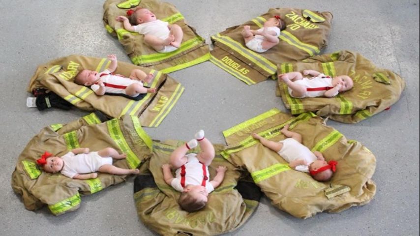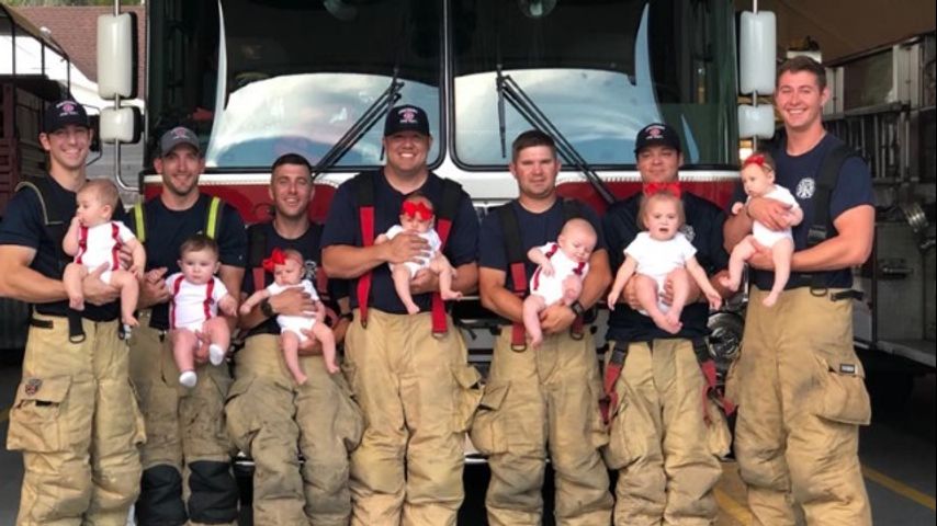 Within the past eleven months, the department says it has had that many of its firefighters welcome new bundles of joy into the world. The crew members decided to have a little fun with the happy coincidence, showing off the wee ones on their dads' bunker coats.