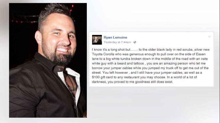 Between Thursday morning and Friday afternoon, nearly 4,000 people shared Ryan Lemoine's Facebook message about the help he received when he was stranded on the side of Essen Lane this week. Lemoine pointed out, his stature can sometimes be deceived as unwelcoming, yet it did not frighten one woman who stopped to help him – and he wants to find her.