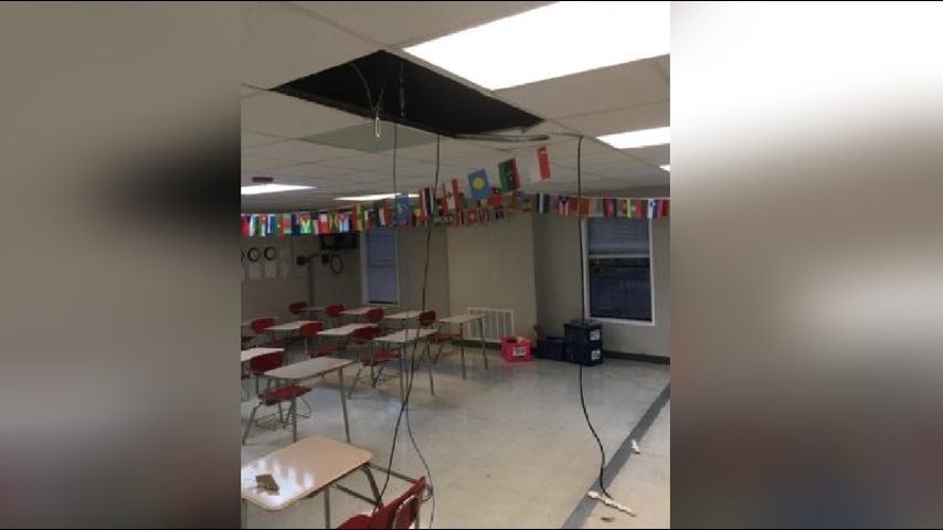 Surveillance video captured at least one person stalking around the outside of the school. Photos showed the aftermath of the break-in, including a collapsed ceiling tile and shattered windows.