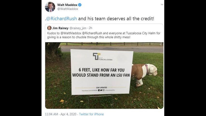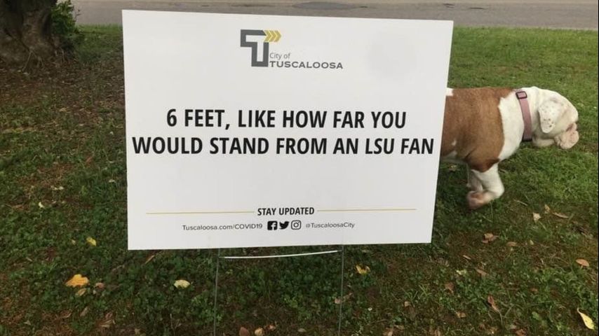 "In the midst of the coronavirus chaos, we have to smile," Tuscaloosa mayor Walt Maddox said about the sign. "Nothing provides hope for the future better than Alabama football," he said.