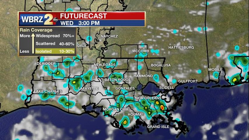 Up Next: Some changes come to end the week. Thursday through Saturday will have a less stable atmosphere over Louisiana with the result being scattered afternoon showers and thunderstorms. More rain and cloud coverage in the afternoon may serve to stop high temperatures just shy of average for the time of year, which is 93 degrees. The next relatively drier trend will come early next week.