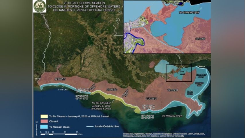 BATON ROUGE - The Louisiana Department of Wildlife and Fisheries announced the 2019 shrimp season will close at official sunset on Monday, Jan. 6, in portions of state outside waters between Caillou Boca and Freshwater Bayou Canal: