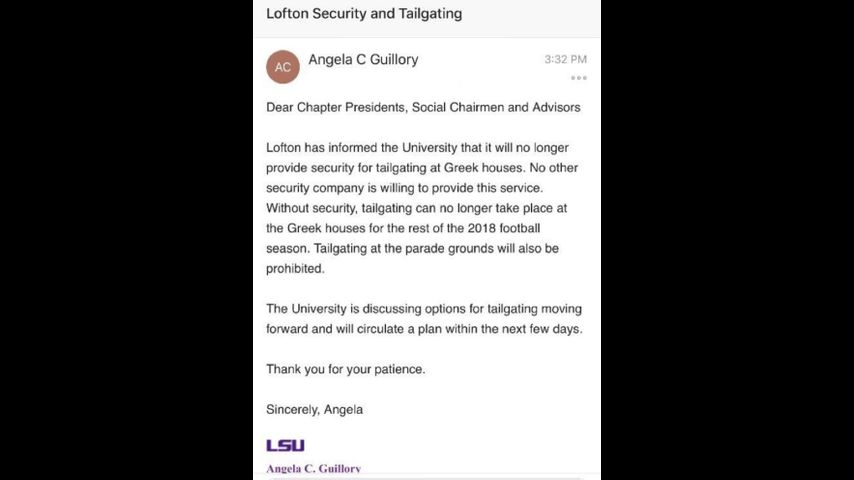 Changes to LSU's tailgating policies were first made known in a notice sent out to members of LSU Greek Life Tuesday. In that notice, a spokesperson said the school was prohibiting tailgating activities at Greek houses and the Parade Ground after the contract with its current security company expired. After that contract expired, the university says no other company has been willing to step up and provide security on gameday.