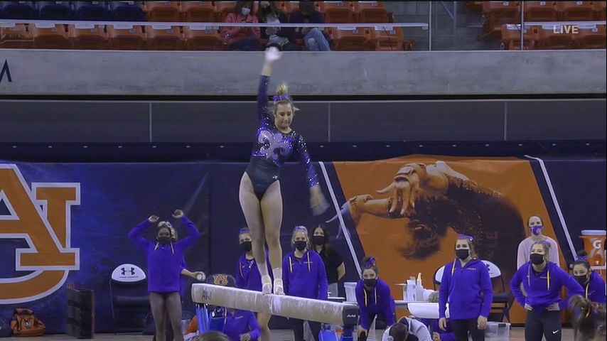 The LSU Tiger gymnastics team broke open a close meet against #22 ranked Auburn with a strong finish on beam and in the process scoring the second-highest score in the nation this season with a 197.550 -197.075 victory inside Auburn Arena.