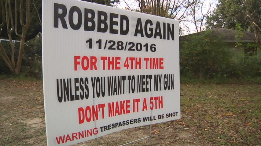 "Robbed again for the fourth time. Unless you want to meet my gun, don't make it a fifth," reads the warning printed on both sides.