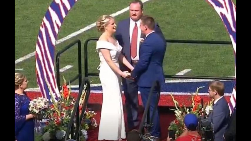 ORCHARD PARK, NY - Die-hard Bills fans, Mackenzie Park and Jordan Binggeli tied the knot during a ceremony at halftime of the Patriots-Bills game on Sunday and they wanted none other than former LSU football star, Kyle Williams to officiate the ceremony.
