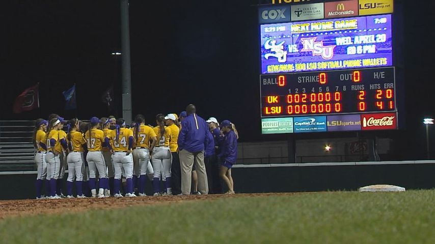 Kentucky scored in a wild third inning, as the LSU battery failed to get a called timeout granted and with the bases loaded Nikki Sagermann raced home for third with the stolen base and a run scored.